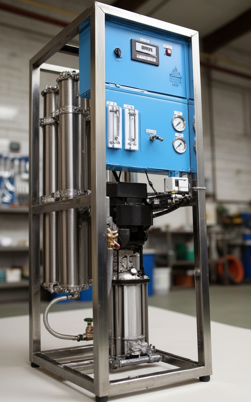 Unit ini dilengkapi dengan sistem pre-treatment menggunakan Big Blue cartridge filter yang berfungsi menyaring partikel dan kontaminan sebelum proses osmosis. Proses pemurnian utama menggunakan membrane RO tipe BW4040 yang terintegrasi dengan pompa booster stainless steel multistage, sehingga menghasilkan performa filtrasi yang optimal dan konsisten.